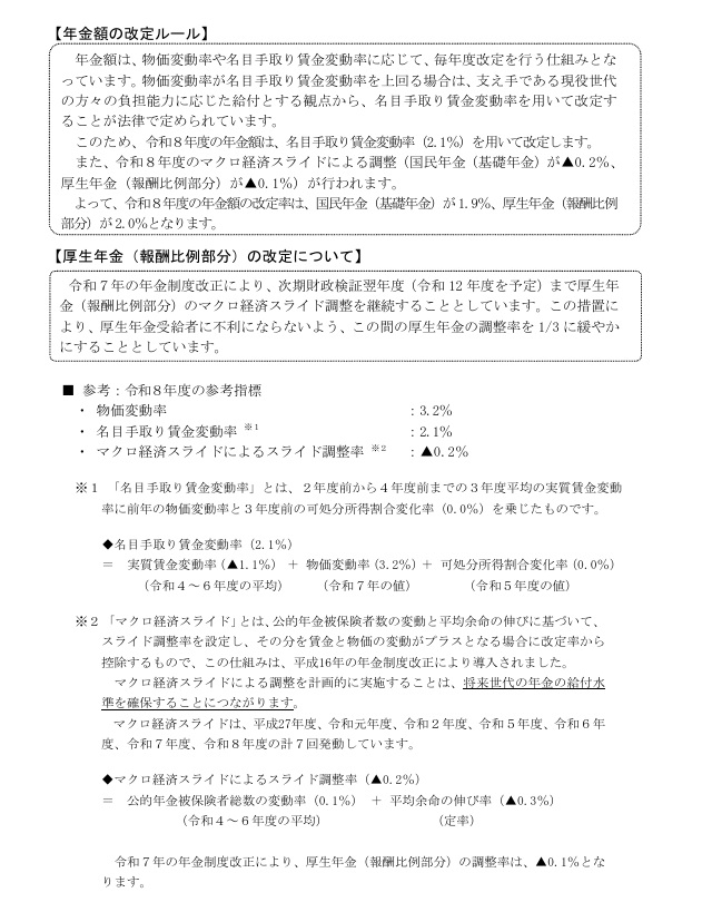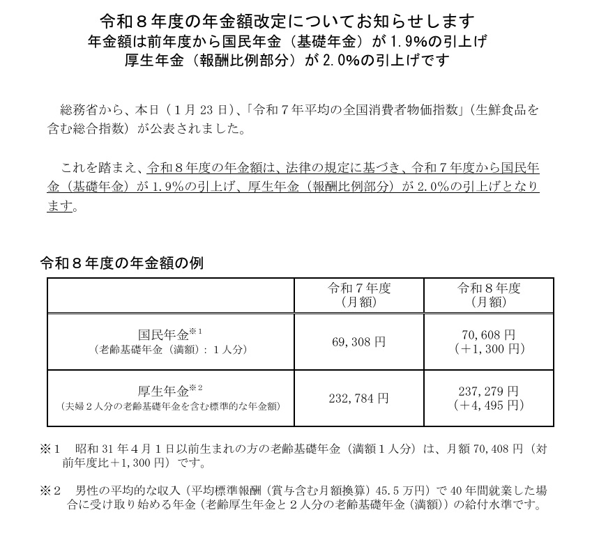総務省から令和7年平均の全国消費者物価指数が公表され、それに伴い令和8年度の改定率も決定、厚生労働省から令和8年度の年金額が公表されました。