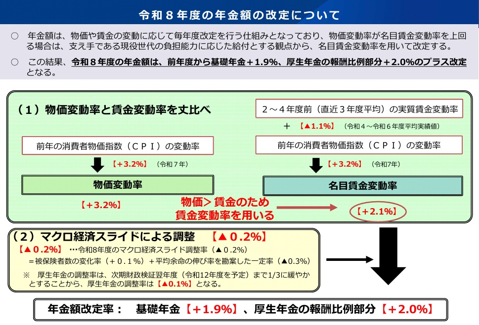 前年より1.9%の上昇となりました。4年連続の引き上げ改定で、年額80万円超が続きますね。また厚生年金の調整率は、次期財政検証翌年度(令和12年度を予定)まで1/3に緩やかとすることから、厚生年金の調整率は▲0.1%を適用しますので2.0%の上昇となります。
